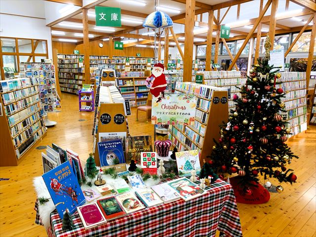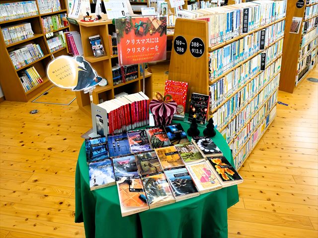 <クリスマスツリーの飾りつけと本の展示>