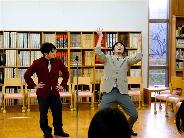 文化祭で全校生徒を大爆笑させた1年生の漫才コンビが、今回のイベントのために新ネタを作って2日連続で披露してくれました。図書館のイベントとあって、図書館のネタも作ってくれました。相変わらずの面白さに図書館が笑いに包まれました。終了後はなんとサインを求める行列ができていました。