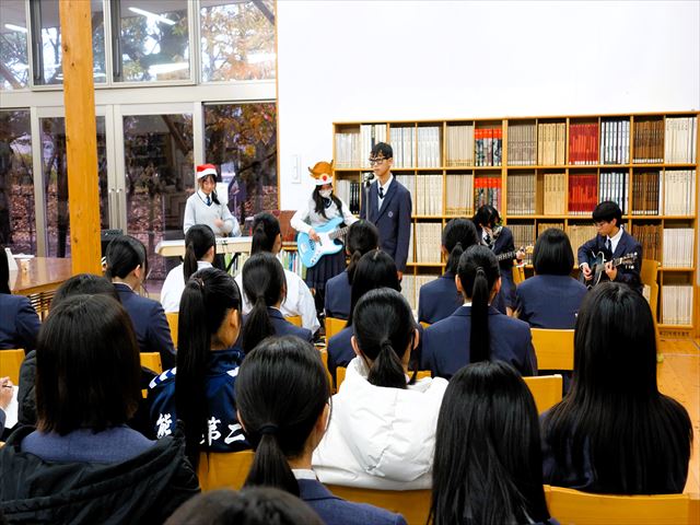1年生バンドのERYは結成2か月のバンドです。back number のクリスマスソングを演奏してくれて、一気にクリスマスらしい華やかな雰囲気になり、図書館が一体感に包まれました。