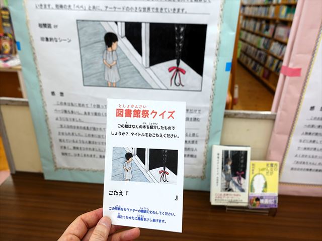 さらに、昨年好評だった「図書館祭クイズ」も再び登場!問題用紙にプリントアウトされた絵を頼りに、同じ絵が描かれたパネルを探して何の本を紹介しているか回答するというミッションです。クイズのおかげで、よりじっくりパネルを楽しんでいただけました。