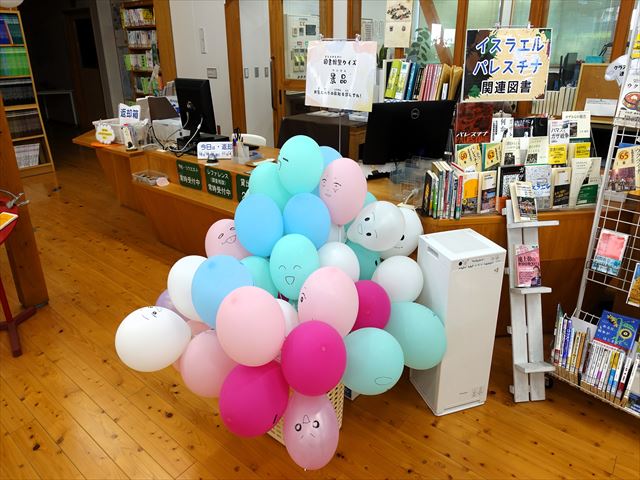 正解者には、図書委員がさまざまな顔を描いたスペシャル風船をプレゼント!参加者はなんと44人、用意した風船はすべて無くなる大盛況ぶりでした。子どもたちも大勢参加し、一生懸命に難しい本のタイトルを書いてくれました。