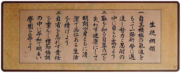 孤独自省の上に自らを高めつつ人格の中心たる責任感に徹し、礼節を尊び、互譲親和の温き雰囲気に包まれて、若き感激と友情の交錯が織りなす切磋琢磨のうちに明るい希望に満ちた学園が伸びやかに展開し、真に気持ちよい人間修業の緑地帯たらんことを念ずるものであります。~