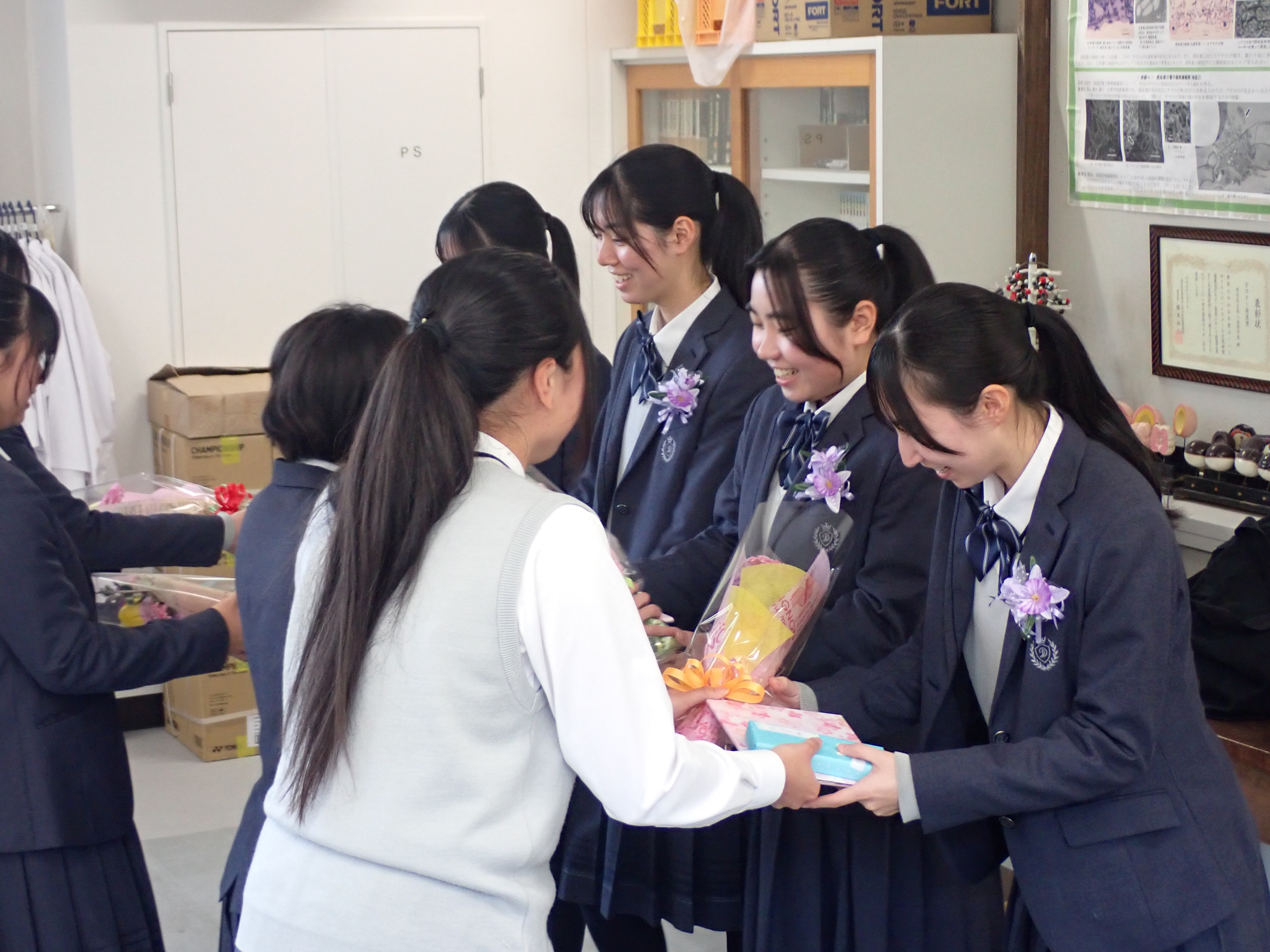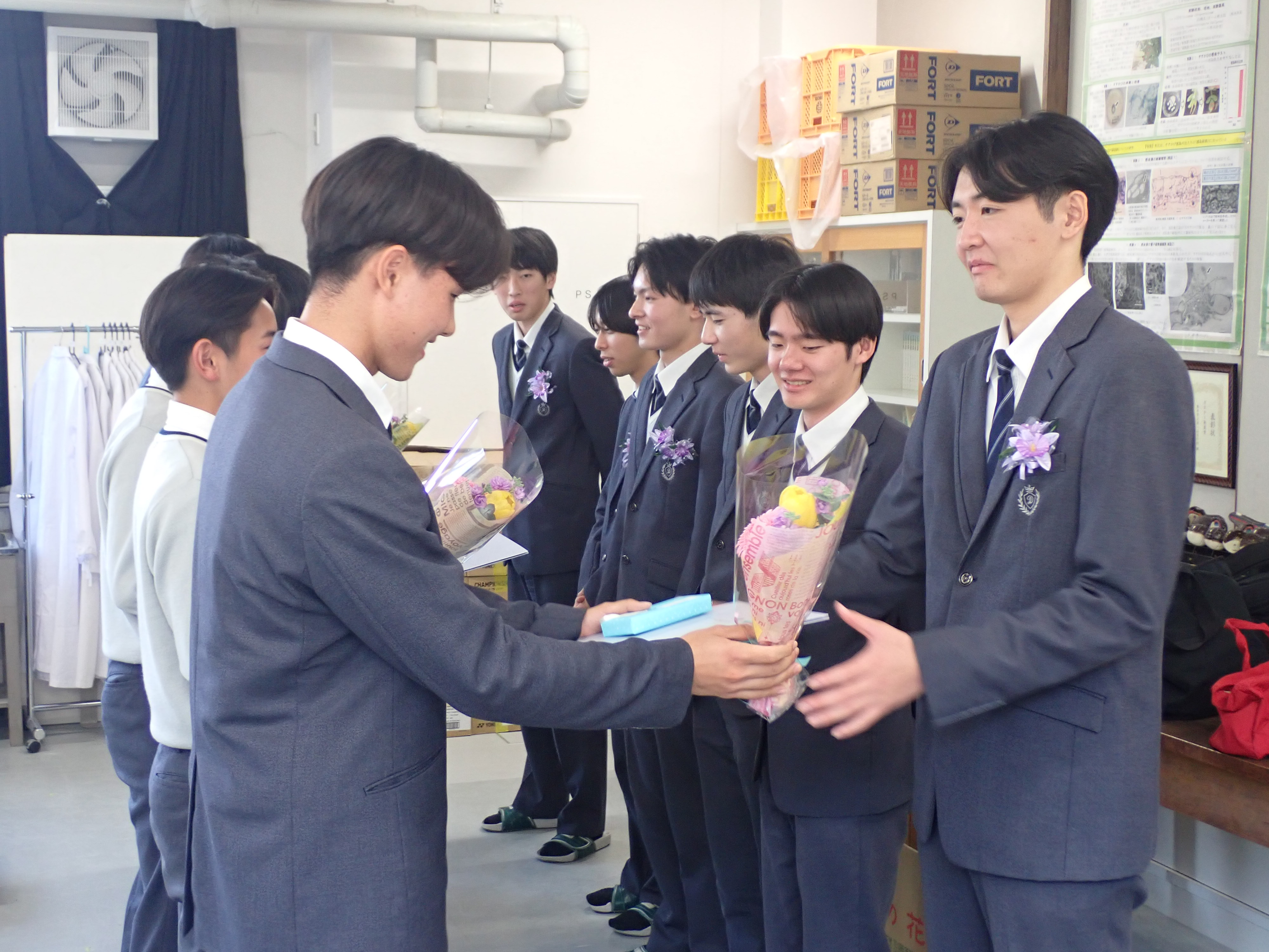 卒部式では、はじめに3人の顧問の先生から卒業生に向けてメッセージが送られました。ぞの後、10人の卒業生一人一人から挨拶をしてもらいました。卒業生の言葉には、部活動への思い、後悔、また後輩への期待などが込められ、聞き入っていた1,2年生も先輩の気持ちを受け取ってくれたと思います。卒業生の挨拶の後には、男女のキャプテンが挨拶を行い、楽しい思い出やチームの目標を語ってくれました。『先輩方の結果を超えます!』と誓った男子主将藤村くんの言葉には力がこもっていました。後輩から卒業生へ花束とメッセージを書いた色紙が送られ、残り少ない時間で歓談で楽しみました。