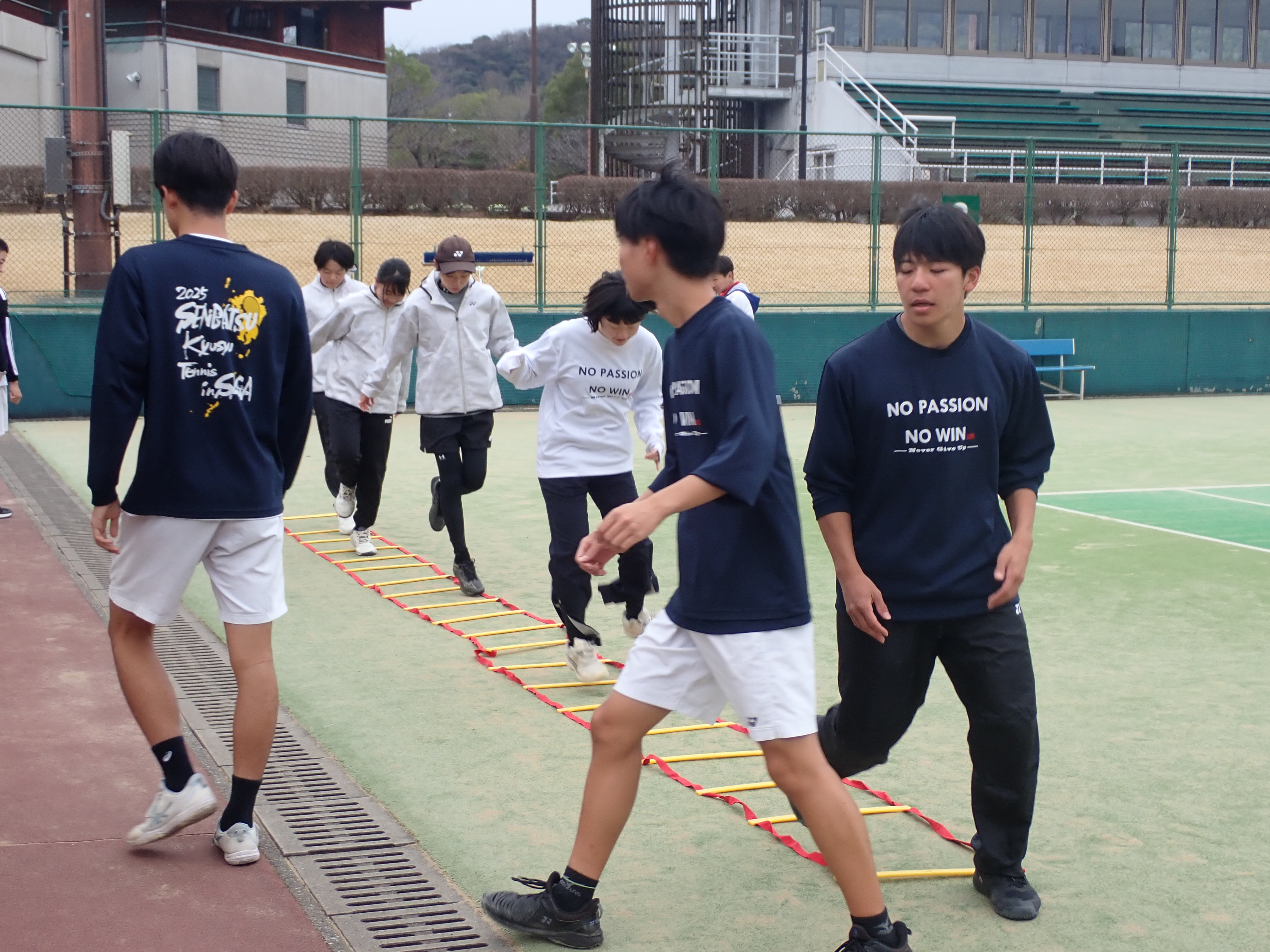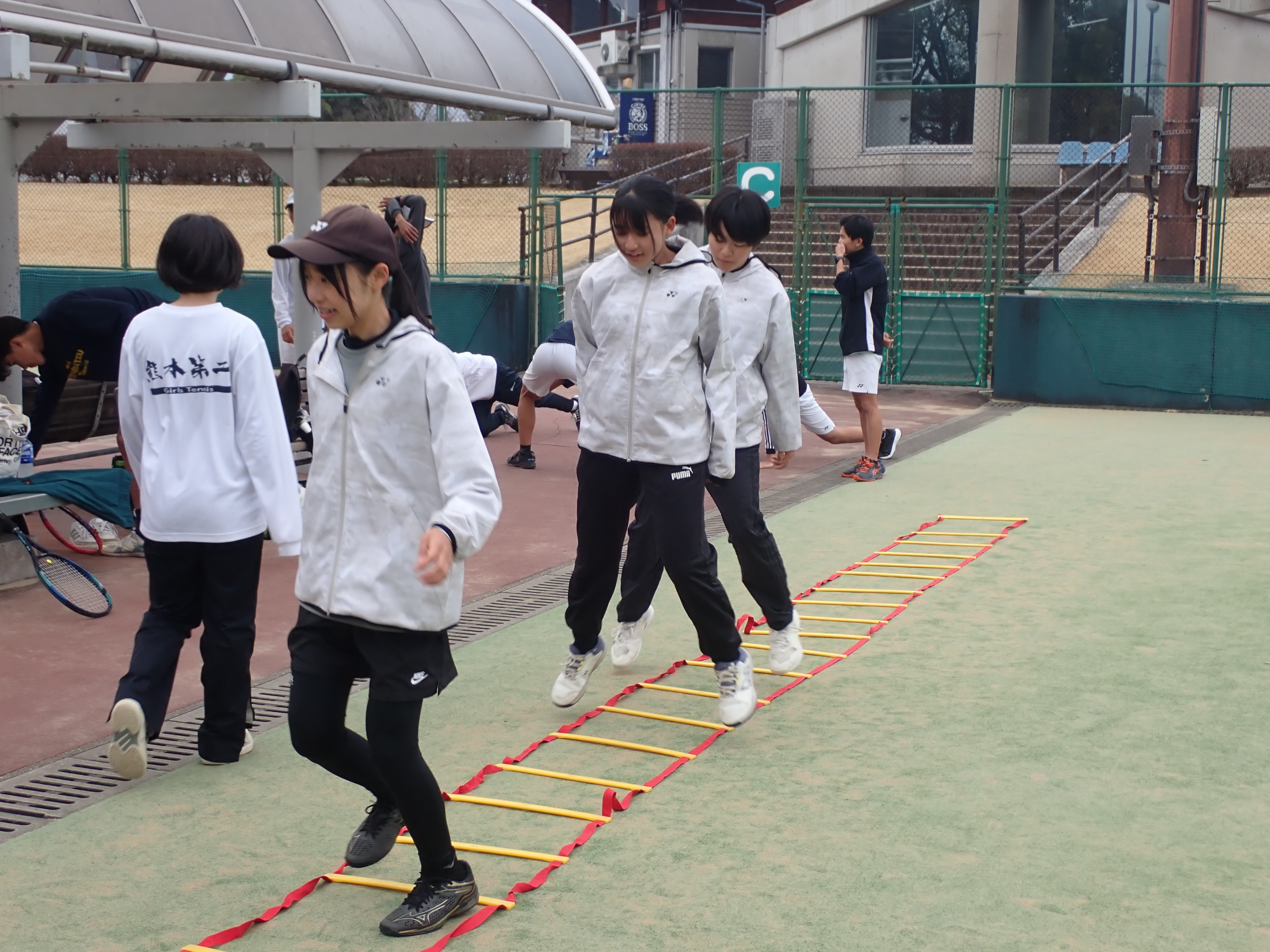 卒業式の余韻が残る3月2日は、さっそく練習開始です。この日は、小雨がぱらつく天気でしたが、午前中、ストロークを中心に練習に取り組みました。前日に卒業式を終えた先輩2人も参加していただき、雨の中、元気いっぱいにボールを追いかけました。
