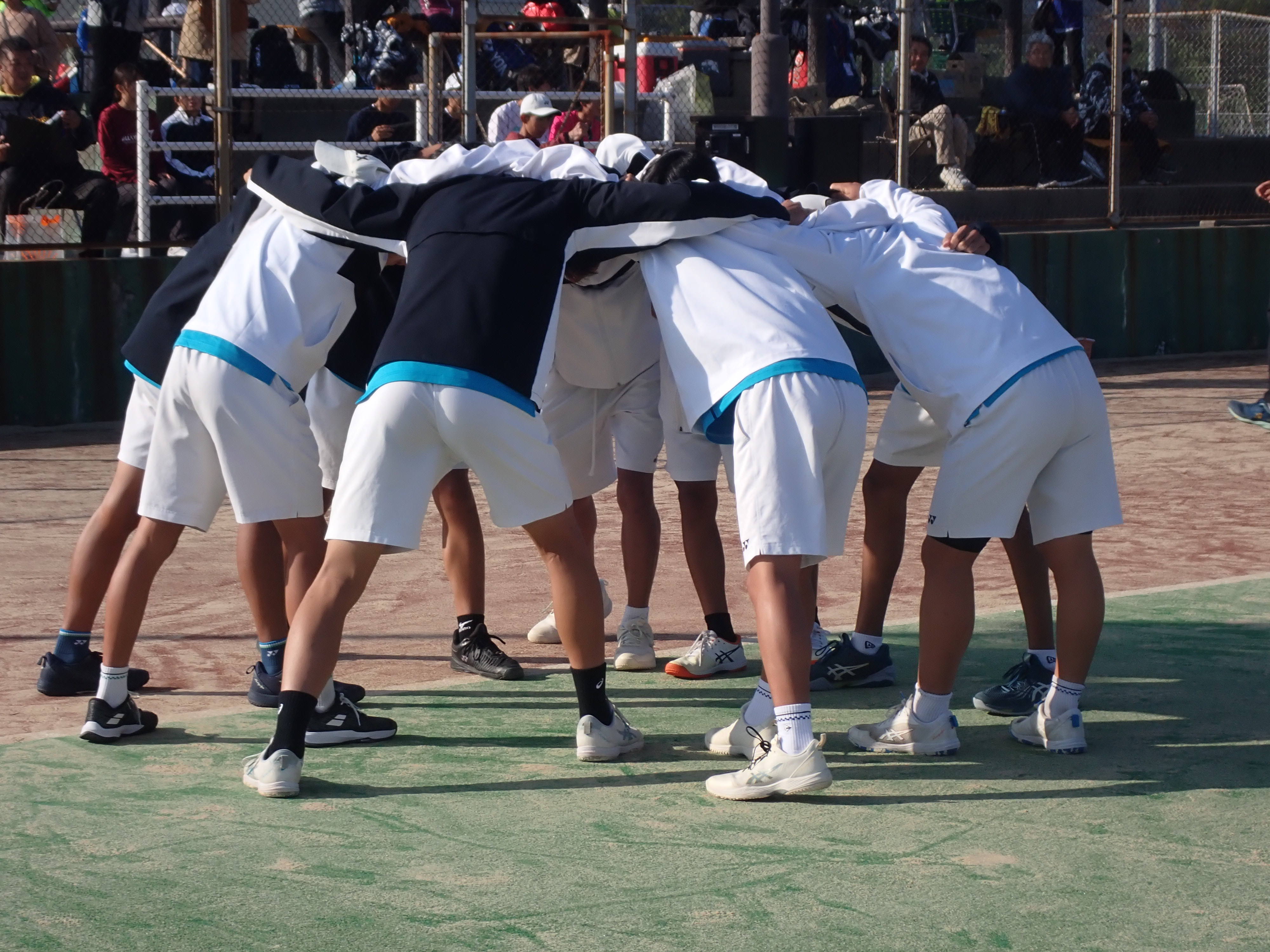 その後、敗者戦にまわり、何とか勝ち進み、最後は全国大会出場をかけて大分鶴崎高校と対戦しました。全国への切符がかかっていることもあって、応援も含めてお互い気合いが入っていました。第2シングルスの峠原(1年)が圧勝して先に1勝しましたが、第1シングルスとダブルスを続けて落とし、1対2で相手に王手をかけられました。第2ダブルスは劣勢ながらも粘りをみせていましたが、先に第3シングルスが敗れ、結果1対3で敗れてしましました。これまで九州大会、そして全国大会を目標に練習に取り組んできましたが、選手全員が悔しい思いをした大会でした。