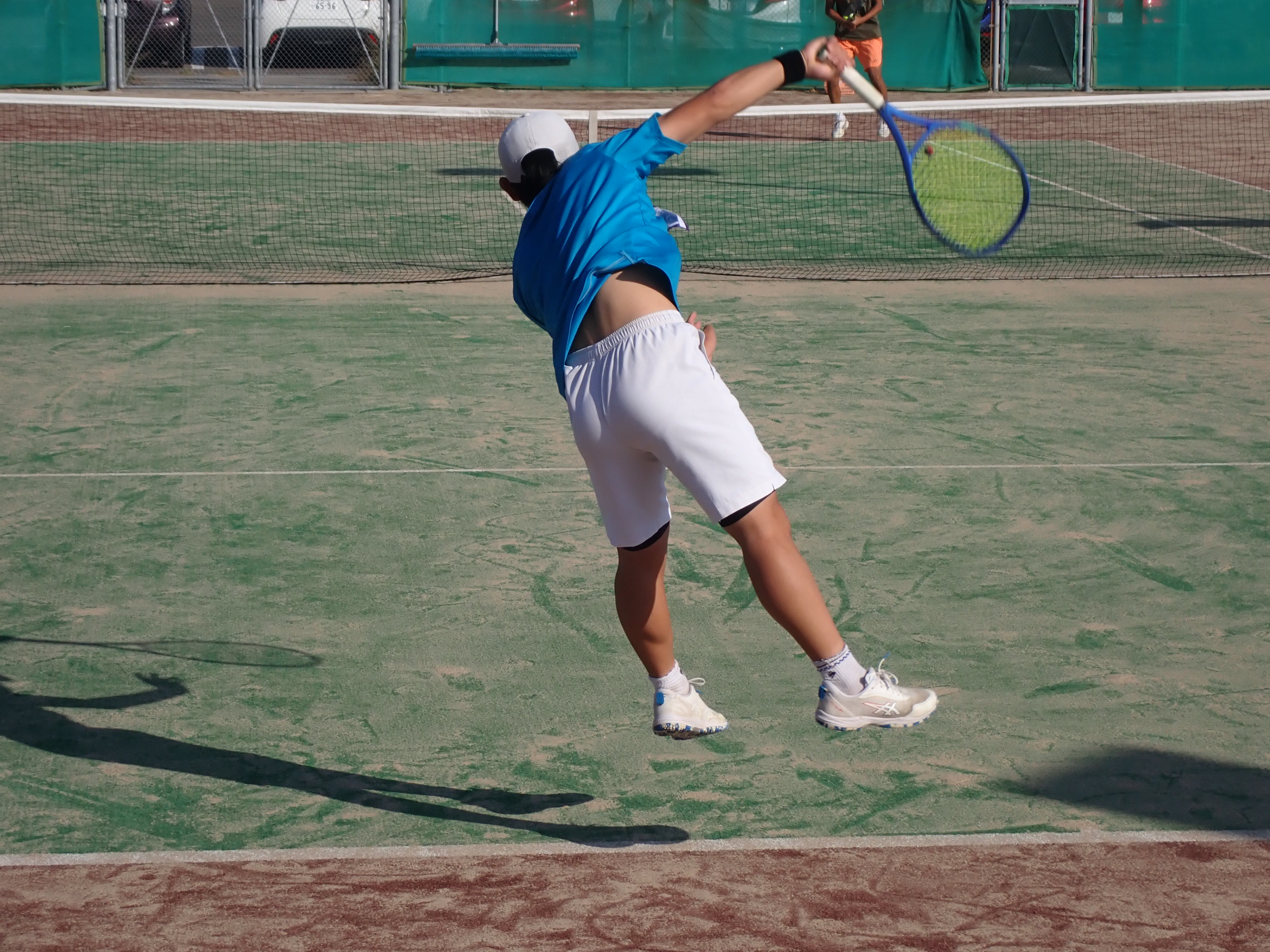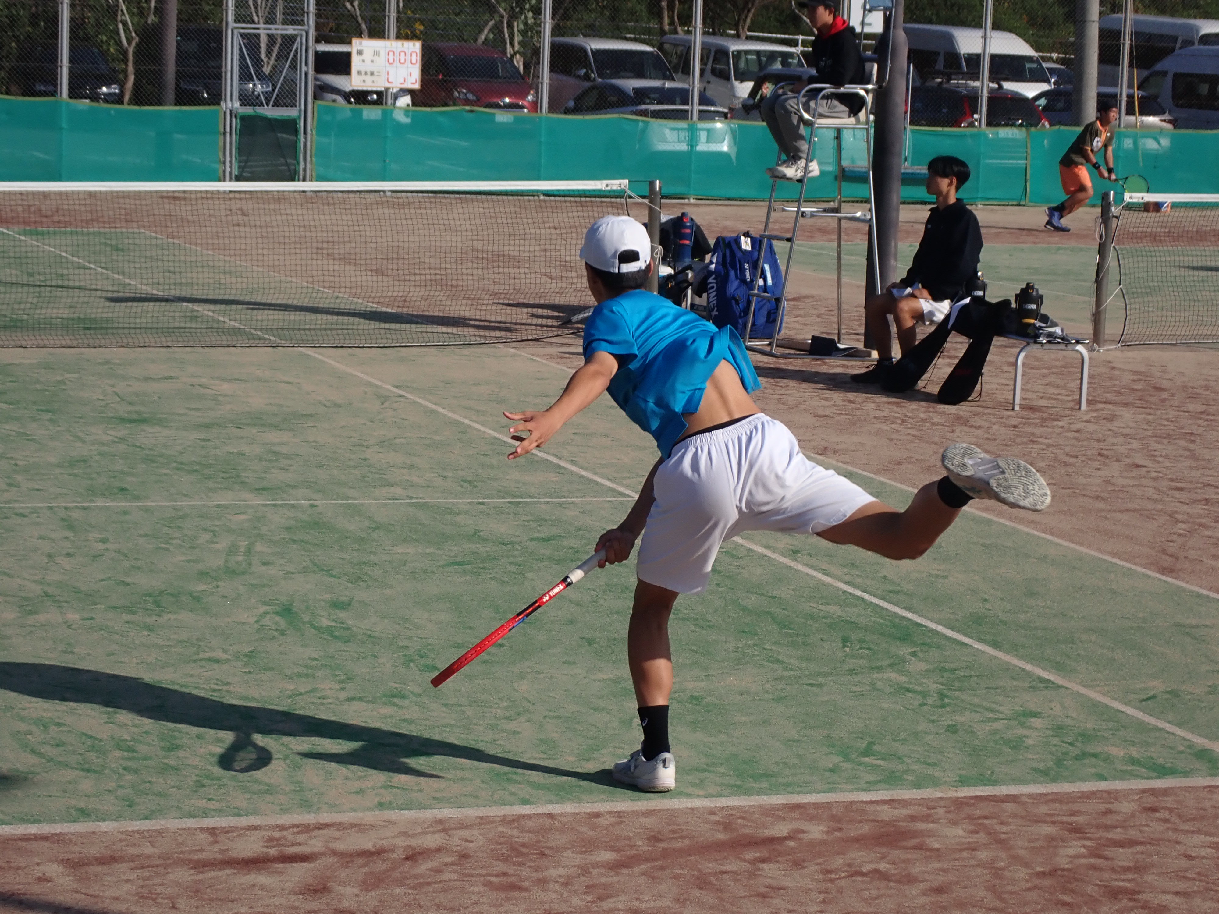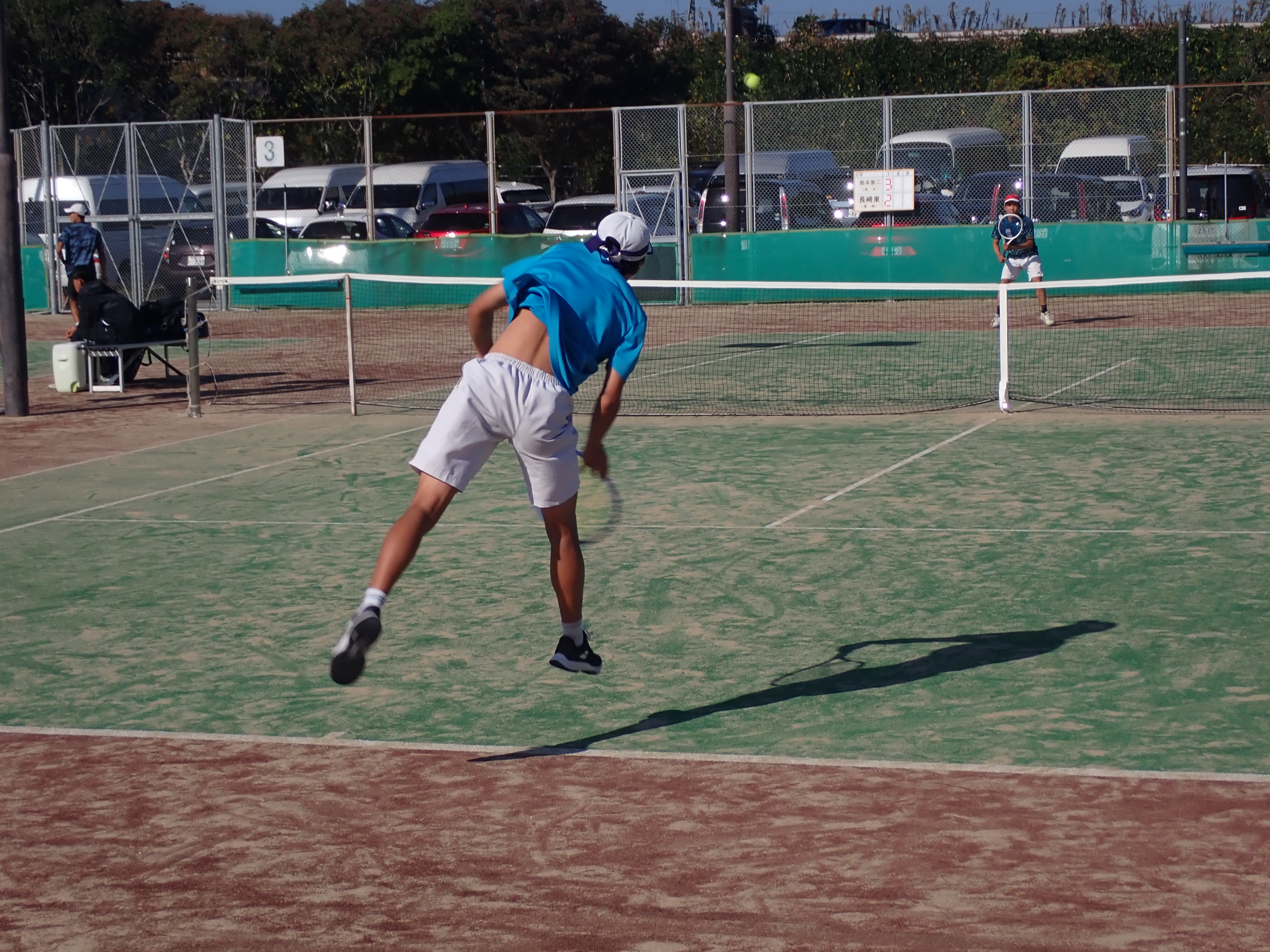 初戦の相手は全国を何度も制覇した強豪の福岡県代表柳川高校です。予想通りパワー、スピード、技術、全ての面で差を感じましたが、選手は臆することなく、むしろ対戦を楽しんでいるような雰囲気がありました。完敗ではありましたが、強豪相手に貴重な経験ができたと思います。第1シングルスに出場した福田(1年)は相手のNo1選手と対戦し、終盤まで互角の戦いを繰り広げました。最終的に逆転負けを喫しましたが、今後の自信につながる内容でした。
