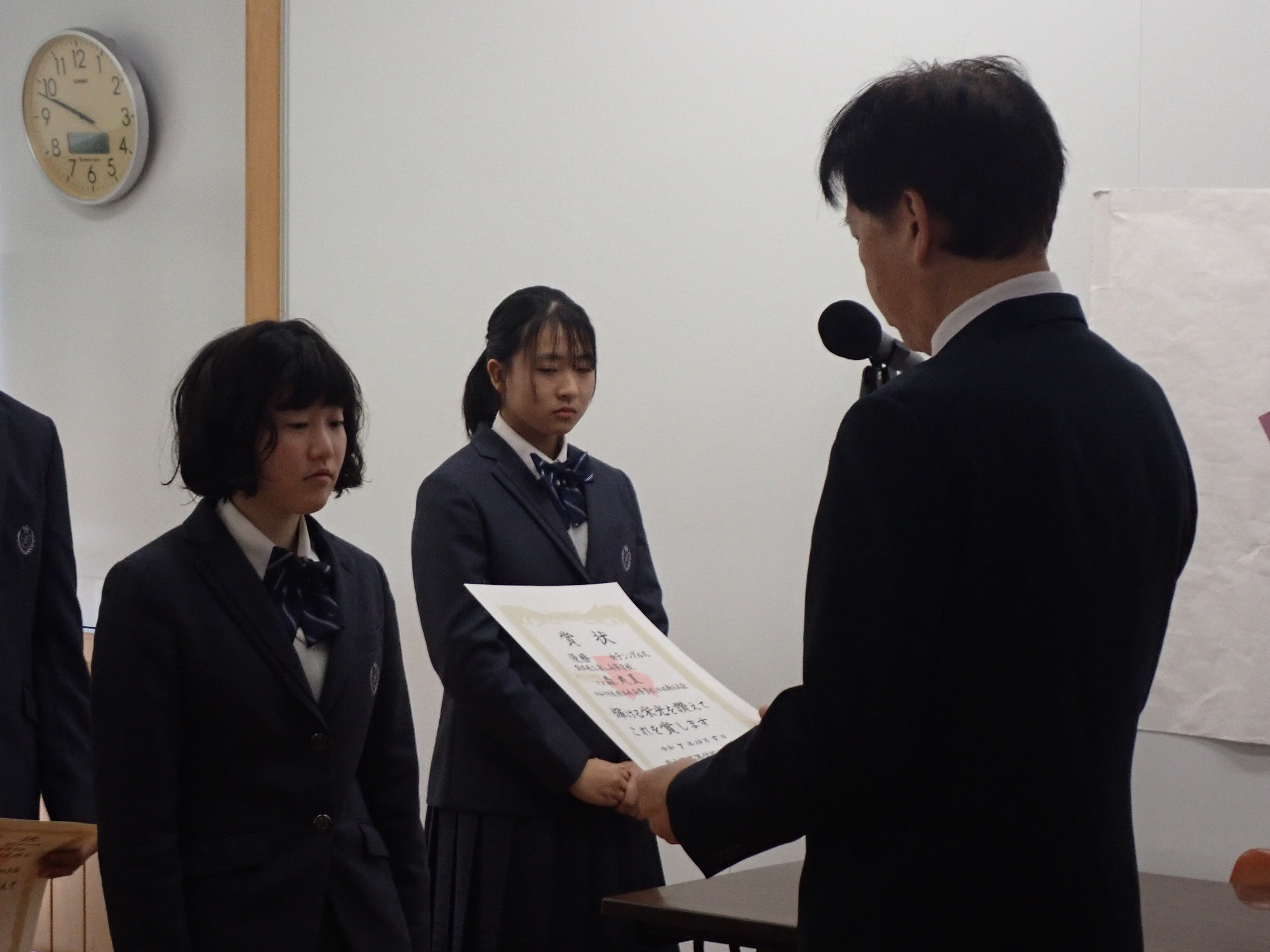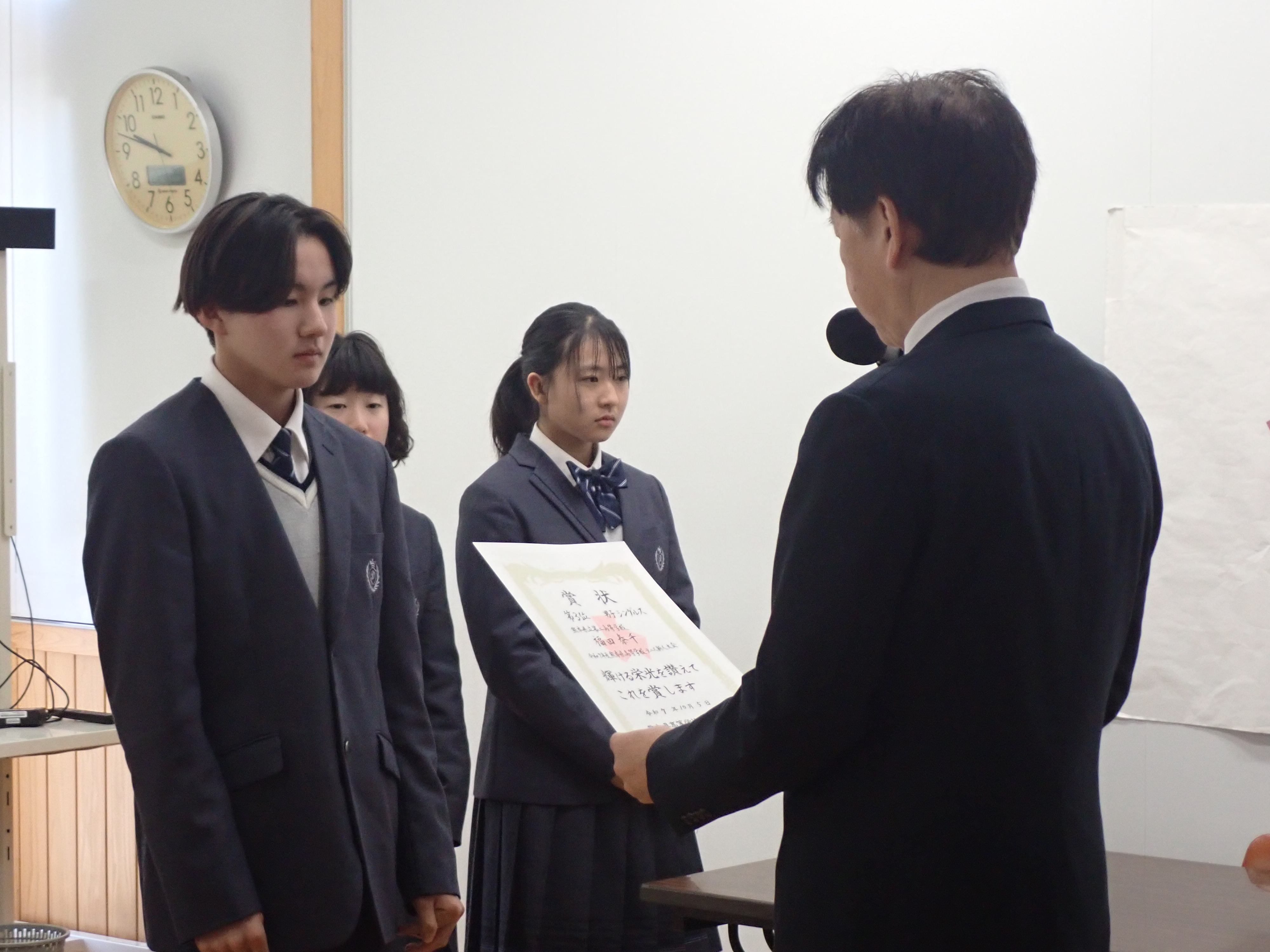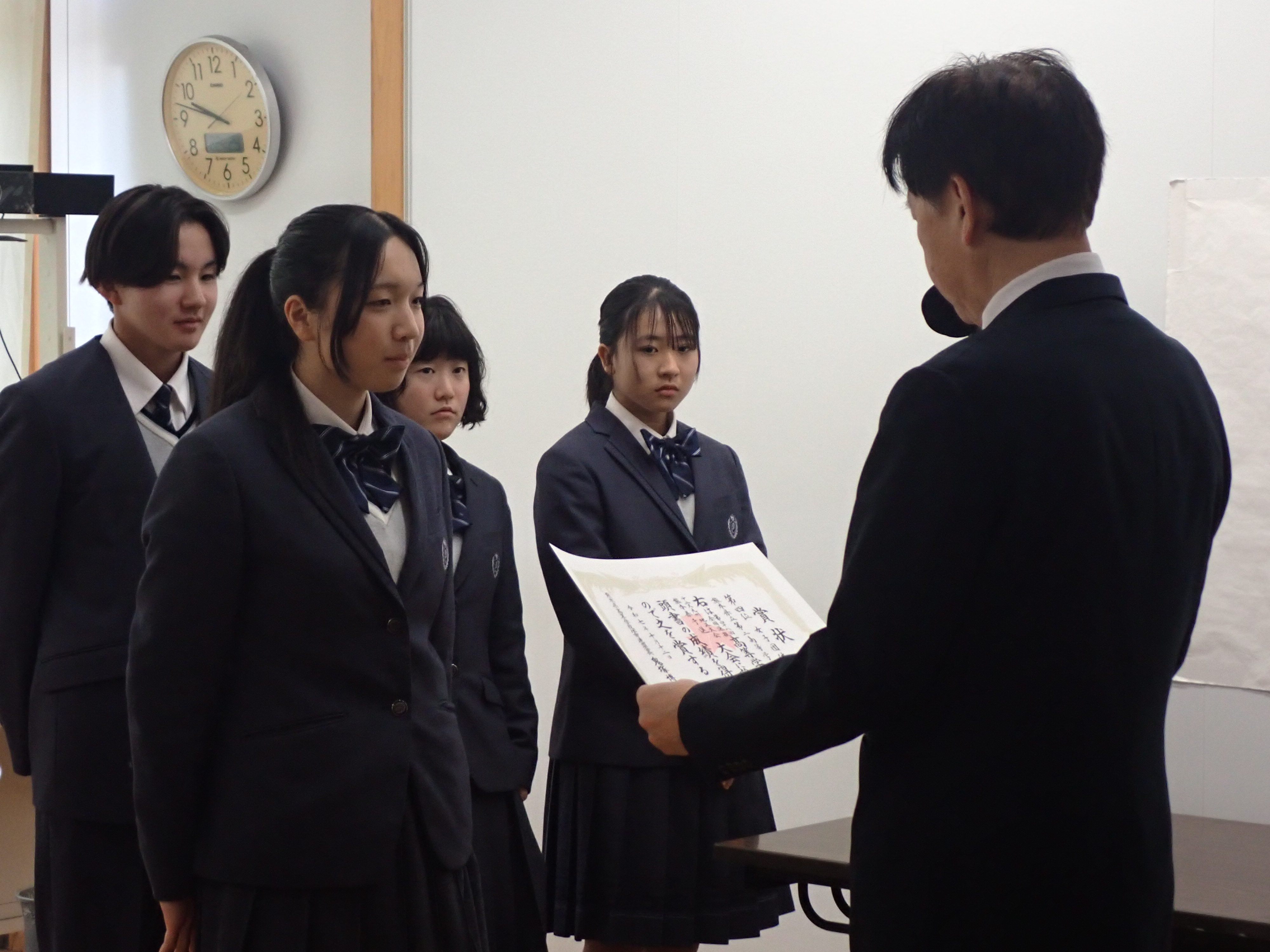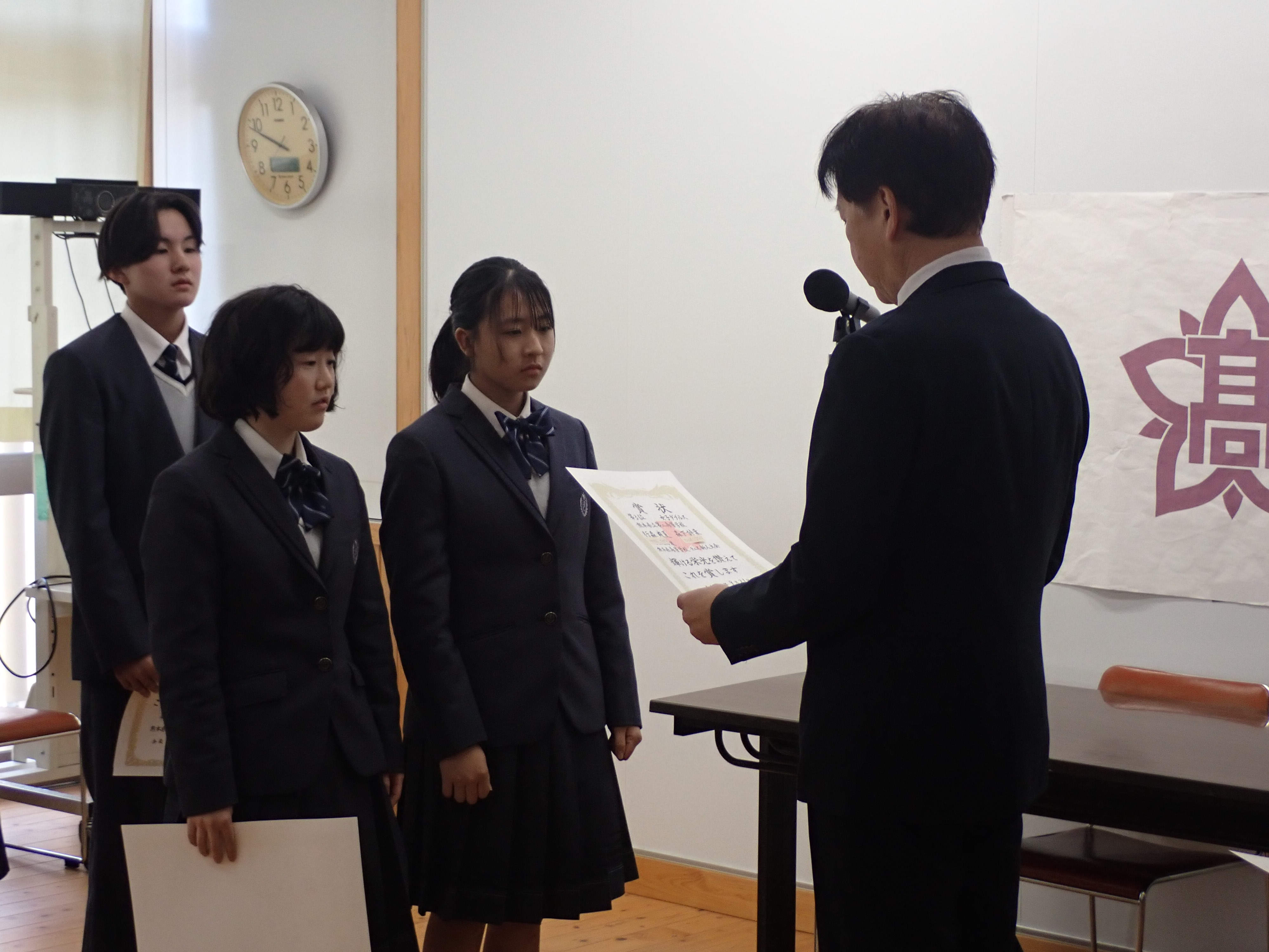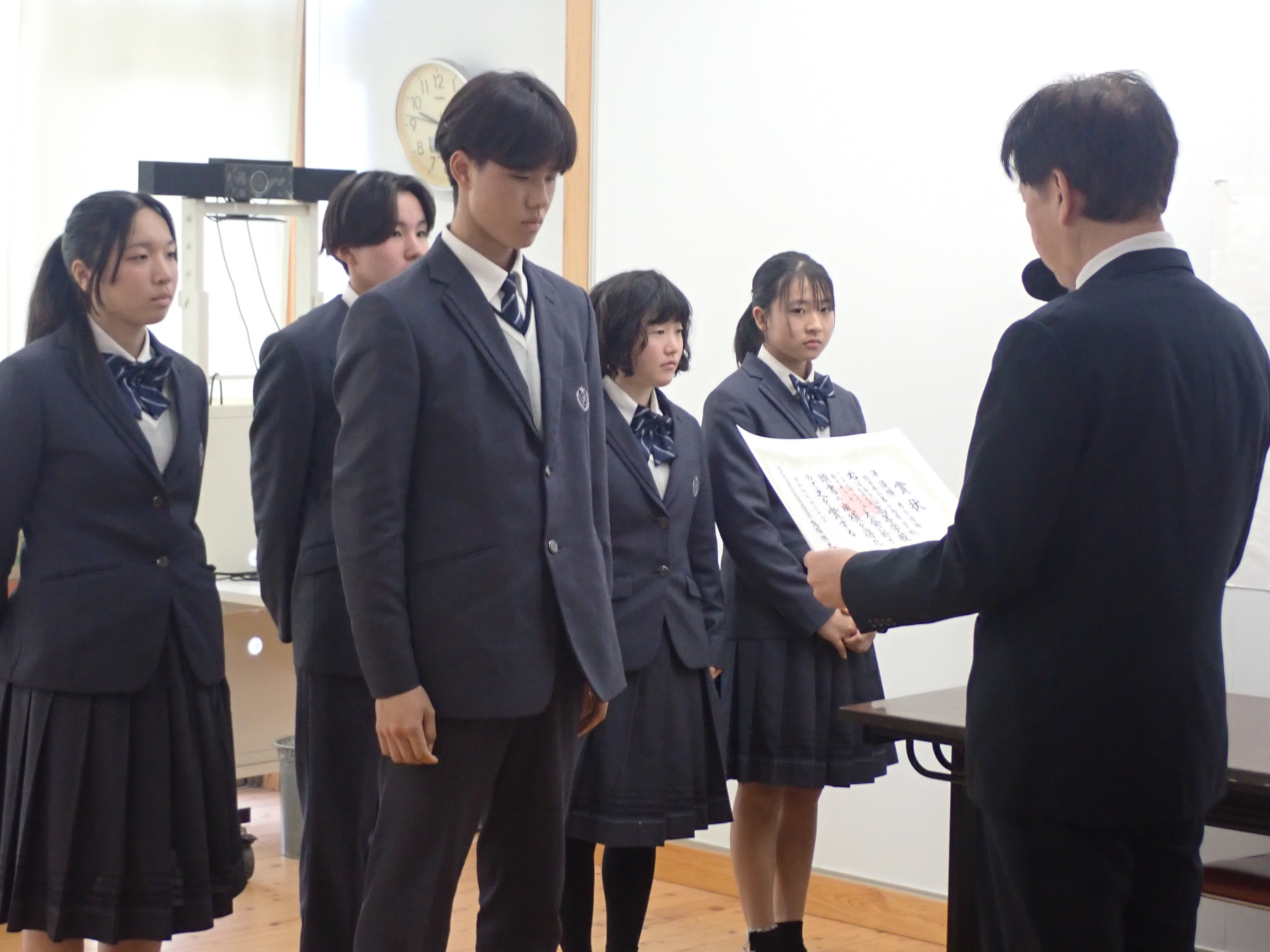 終業式の前に2学期の表彰式があり、始めにテニス部が表彰されました。表彰者は次の6人です。 第48回全国選抜高校テニス大会熊本県予選 男子団体 準優勝 代表:藤村(2-7) 第48回全国選抜高校テニス大会熊本県予選 女子団体 第4位 代表:稲冨(2-2) 令和7年度熊本県高等学校テニス新人大会 男子個人シングルス 第3位 福田(1-7) 令和7年度熊本県高等学校テニス新人大会 男子個人ダブルス 準優勝 福田(1-7)・峠原(1-S) 令和7年度熊本県高等学校テニス新人大会 女子個人シングルス 優 勝 行森(2-A) 令和7年度熊本県高等学校テニス新人大会 女子個人ダブルス 第3位 行森(2-A)・森下(1-1)