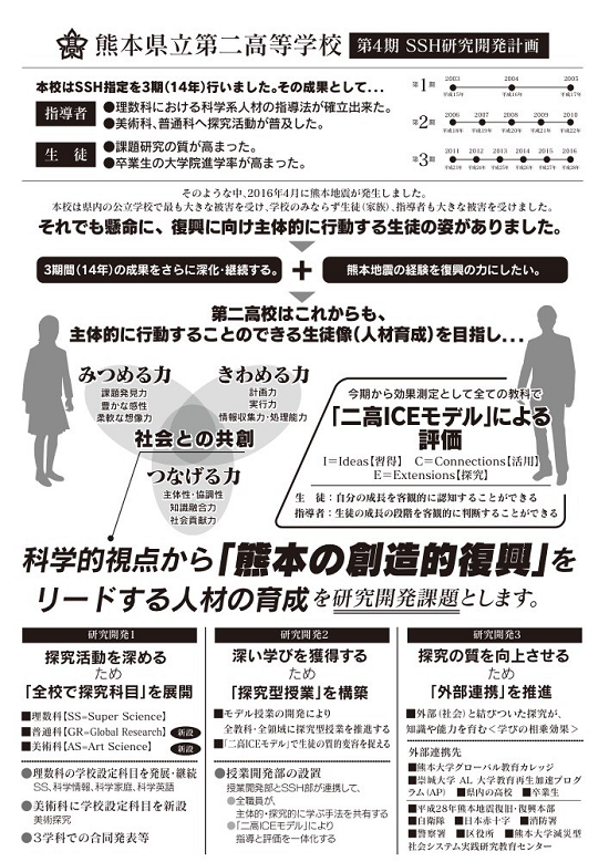 本校は平成15年度から、スーパーサイエンスハイスクール(SSH)の指定を受け、本年度で14年目となりました。平成27年度で第3期目の指定が終了し、平成28年度に第4期目(5年間)の継続指定を受けるため文部科学省に申請を行いましたが、5年間の指定は不合格となり平成28年度1年間の指定となりました。昨年度の申請書の内容を今年度1年間かけて見直し、新たな計画を盛り込んで第4期目の申請をしていましたが、先日、文部科学省から合格の通知をいただきました。平成29年度から5年間第4期目の取り組みを理数科・美術科・普通科の全科、全校生徒を対象に進めて参ります。昨年度はご心配をおかけしましたが、第4期目は、探究活動の深化、授業改善、評価方法の研究などに工夫を加え取り組みます。第4期目の取り組みの概要については、このHPの「SSH」のコーナーに掲載しますのでどうぞご覧ください。