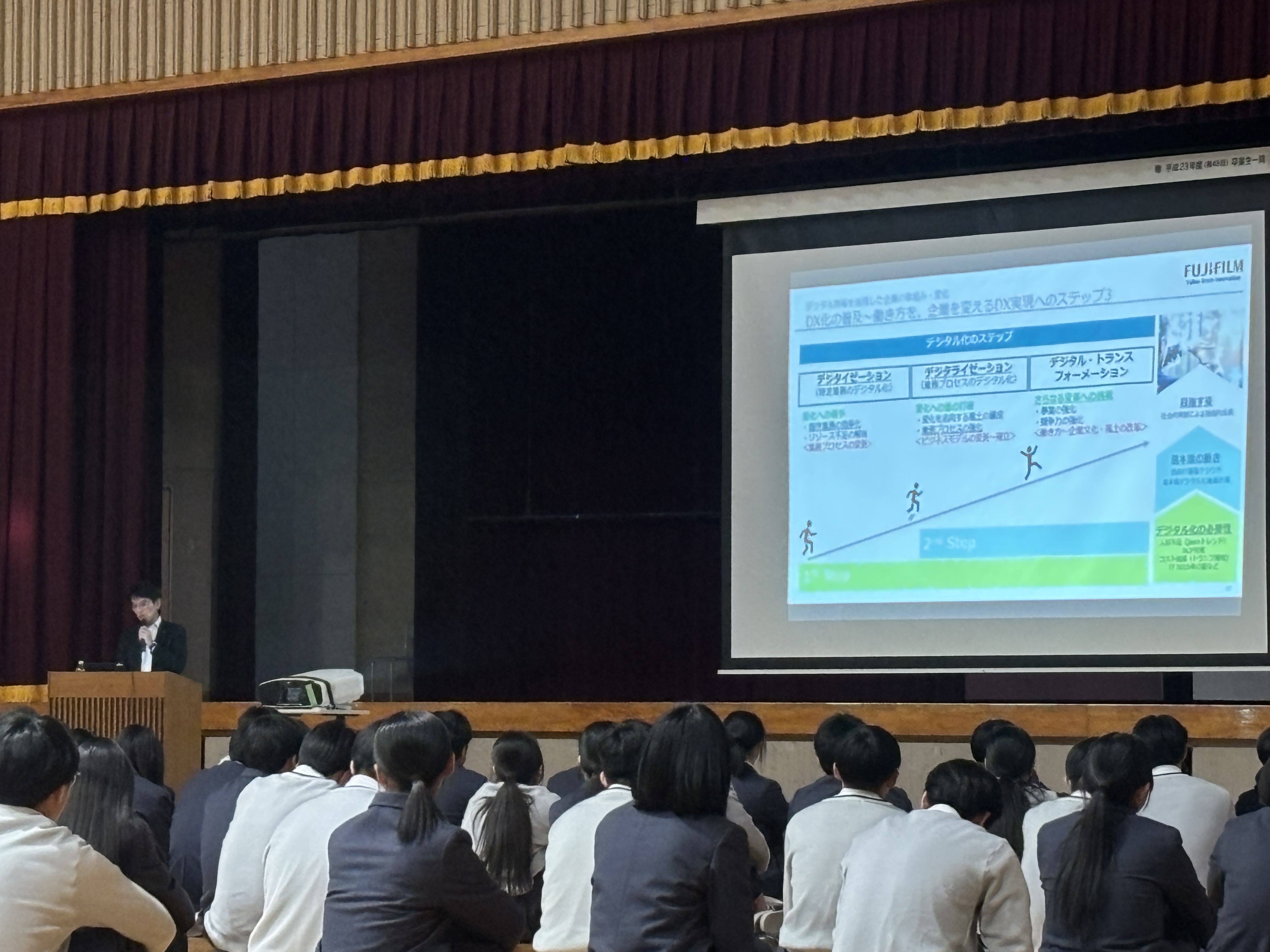12月2日(火)、本校体育館にて、SSH特別講演会(データサイエンス)富士フイルムによる講演会が行われました。今回の講演は、企業活動における核となる考え方、急速に進むデジタルトランスフォーメーション(DX)、そして変化の時代を生きる私たちに求められる行動原理についての講演でした。