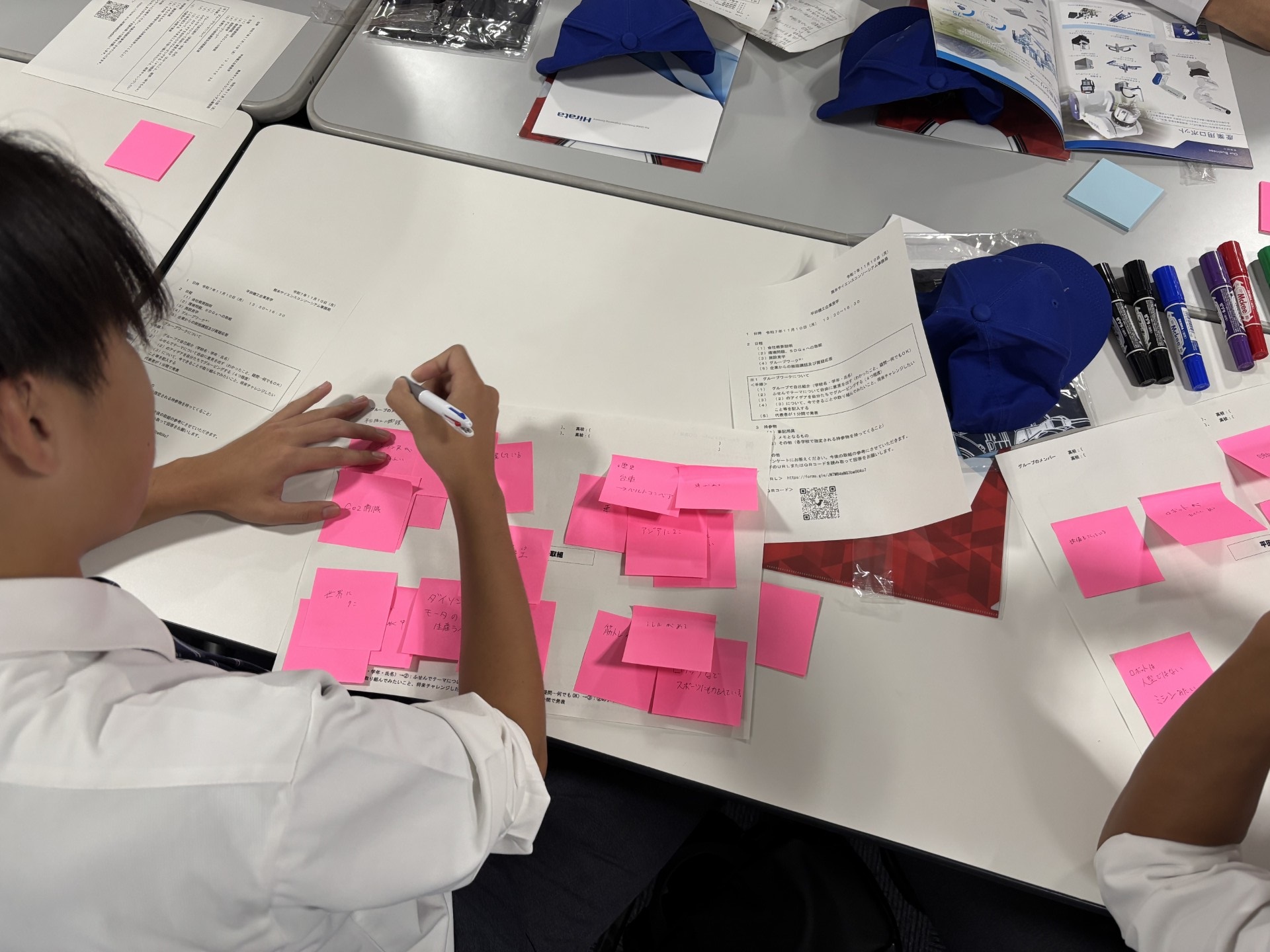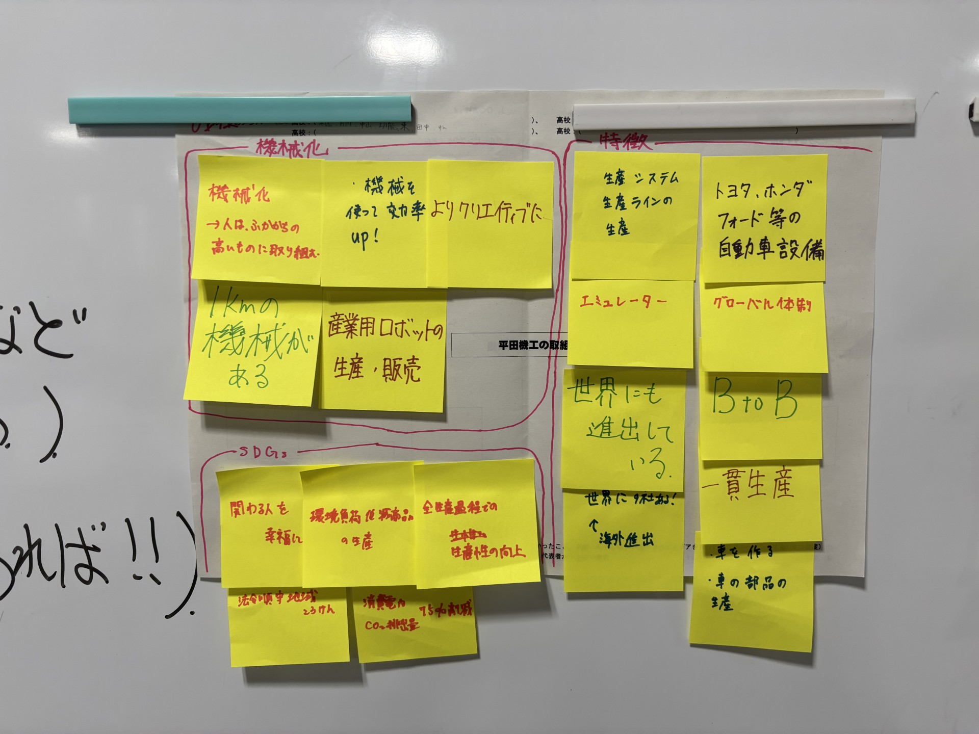 研修の後半では、ワークショップを行いました。本日知ることのできた、平田機工のイメージを1つずつ付箋に書き、カテゴライズしていきます。