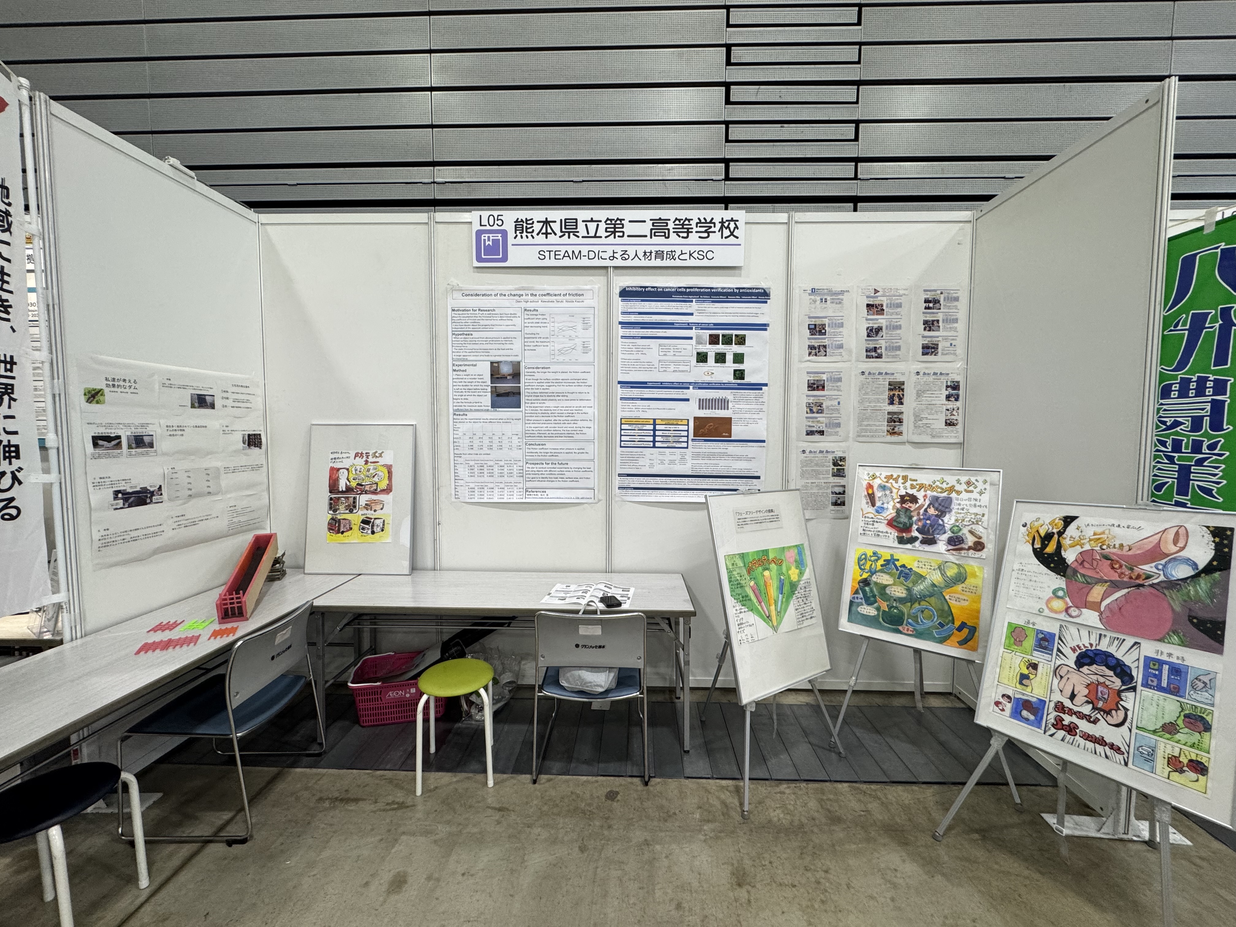 このフェアは、平成28年の熊本地震、令和2年の7月豪雨などからの創造的復興や緑の流域治水の推進に取り組む本県が、豊かで安全・安心な社会基盤の構築の実現を目指して毎年実施しているものです。200を越える企業・行政・学校等から防災に関する商品開発・取り組み等が紹介されるなか、本校からは普通科・理数科・美術科が取り組んでいる探究活動の紹介、熊本サイエンスコンソーシアム(KSC)の活動紹介を行いました。また、2年普通科(希望者)・理数科、1年理数科・美術科の生徒が参加し、企業や行政として行っている大人の「探究」に触れる機会となりました。参加したほとんどの生徒が、新しい価値観に触れることができたと感じたようです。