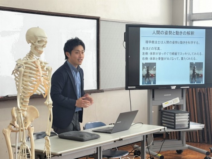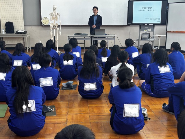 対象は美術科の2年生で、講師は熊本中央リハビリテーション学院で国際介護学科長を務める大村先生と、理学療法学科専任教員の福岡先生です。