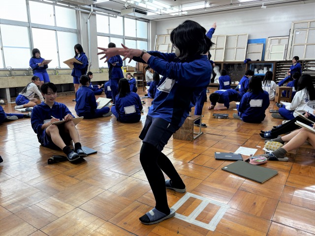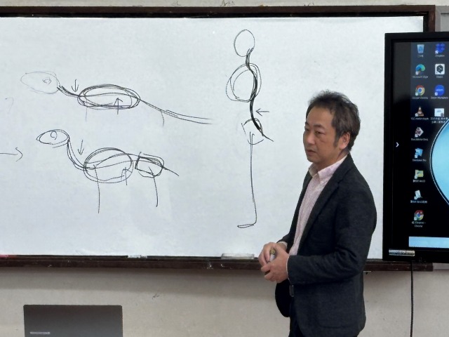 福岡先生からは人の動きと重心、支持基底面の関係などについて、大村先生からは生物学上の骨格の違いやクロッキーのポイントなどについて説明していただきました。