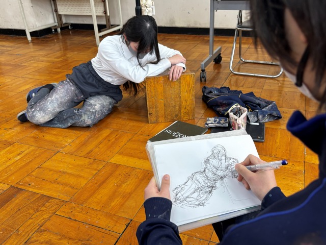 後半は交代でモデルをしながらクロッキーをしました。クロッキーは短時間で対象の特徴や全体を捉えることから、トレーニング的要素の強い描き方です。