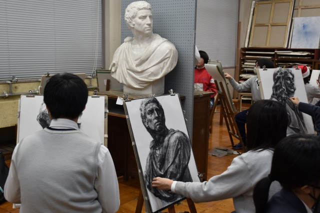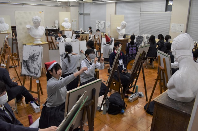 8:30の開始と同時に一斉に石膏デッサンを開始し、心地よい緊張感が広がります。所々にいるサンタの帽子を被った生徒は、今回の審査と講評を務める3年生です。最上級生として手際良く描く姿は頼もしい限りです。
